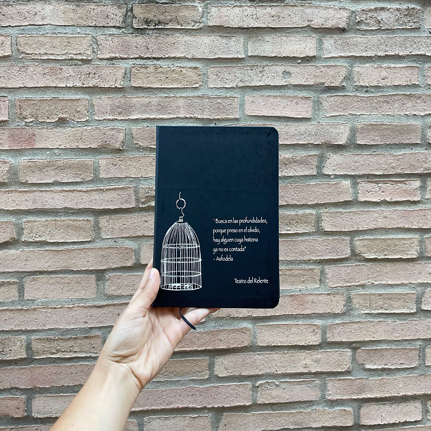 Cuaderno de hoja blanca, sin líneas ni cuadros y tapa dura, con marcapáginas y una banda elástica para cerrarlo. Diseño en su portada con un dibujo de una jaula y un texto que dice así: