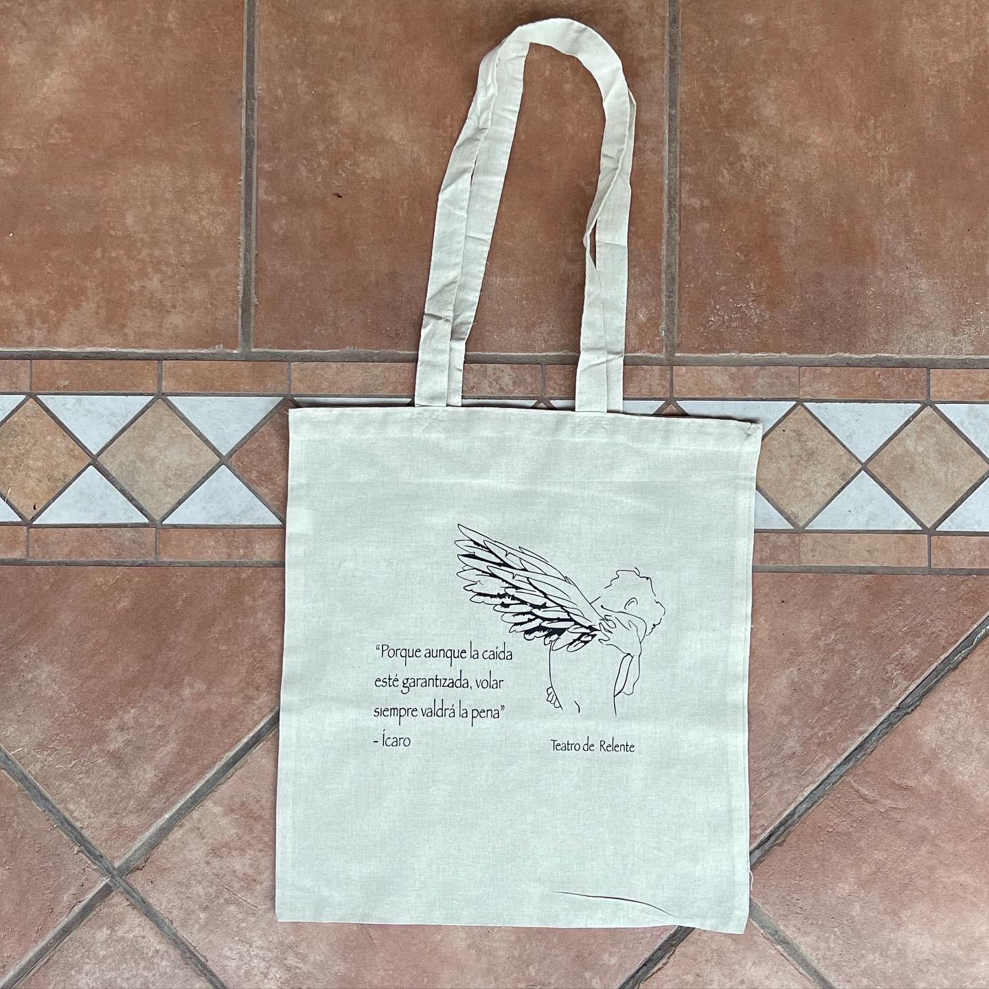 Tote Bag de tamaño medio grande con asas largas. Diseño de Ícaro a uno de los lados de la bolsa y un texto que dice así: